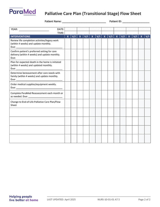 Palliative Care Plan Flow Sheet - Transitional Stage