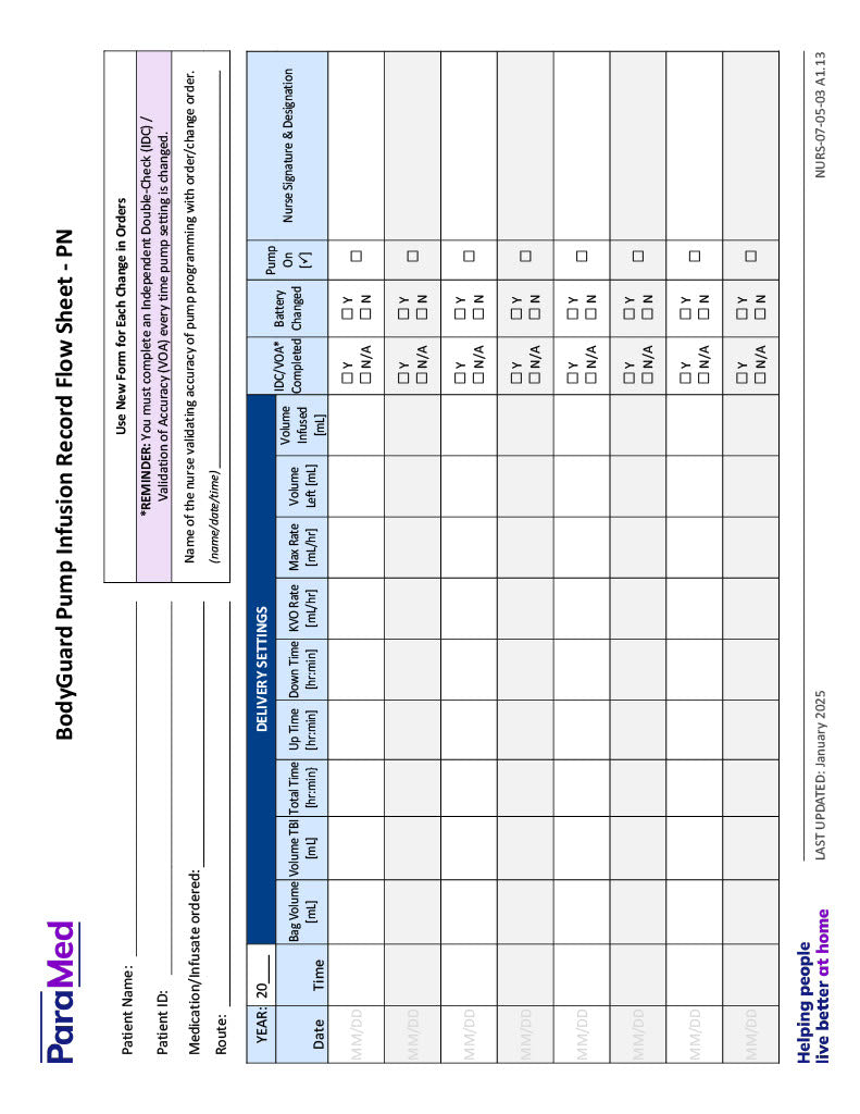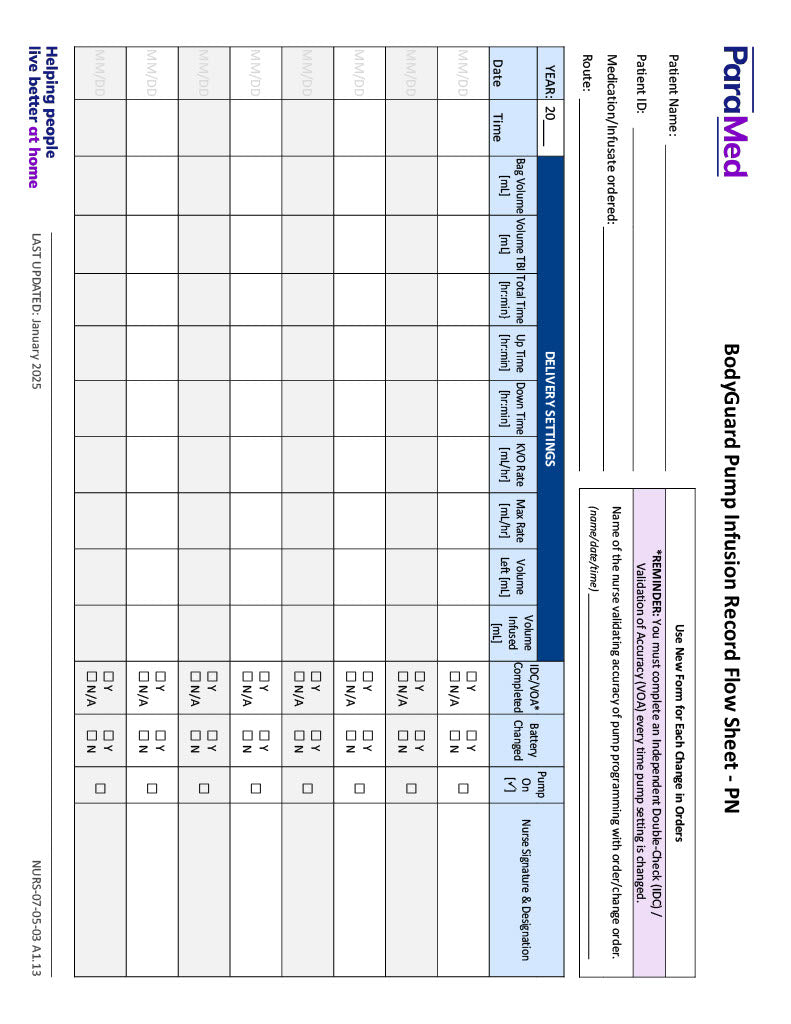 BodyGuard Pump Infusion Record Flow Sheet - PN