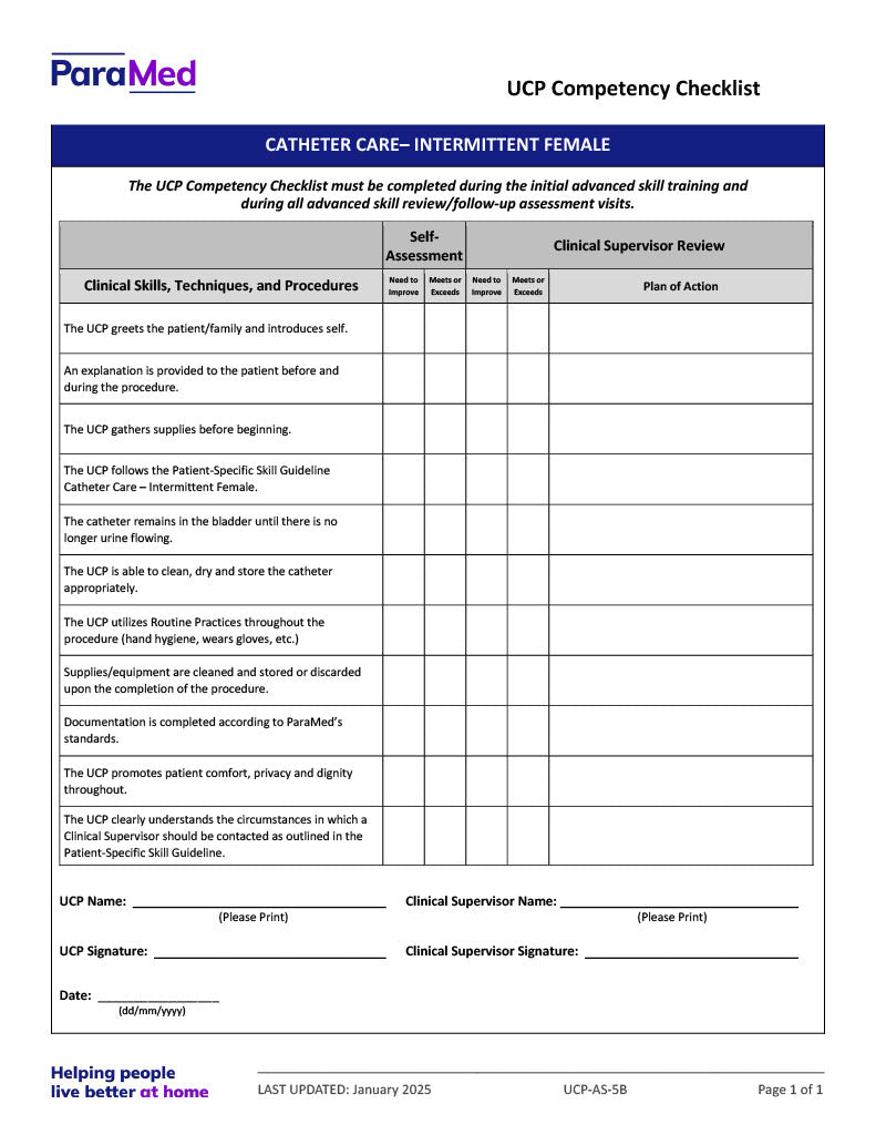 Catheter Care – Intermittent - Female (Competency Checklist)