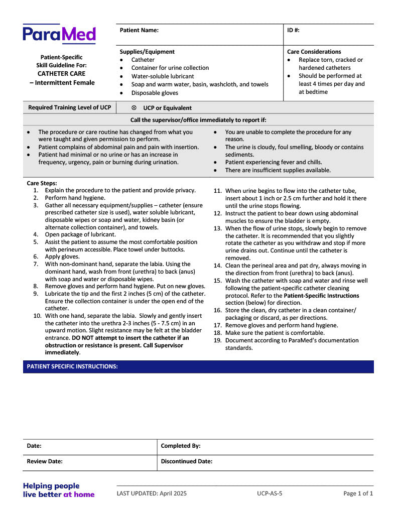 Catheter Care – Intermittent - Female (Skill Guideline)