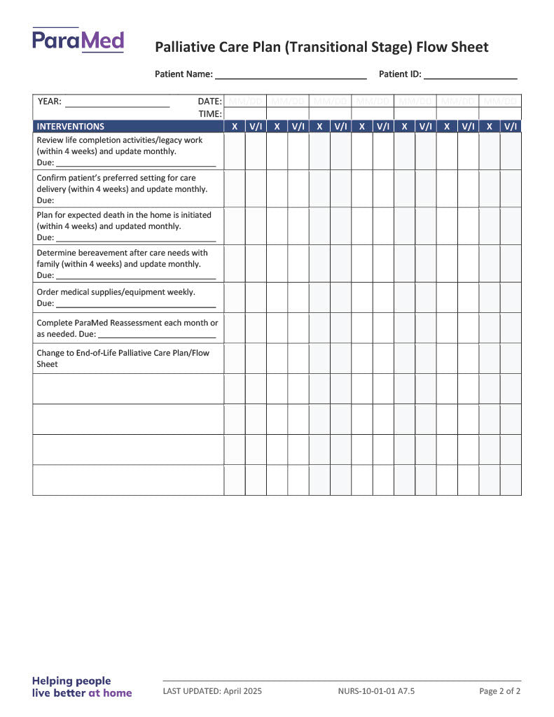 Palliative Care Plan Flow Sheet - Transitional Stage